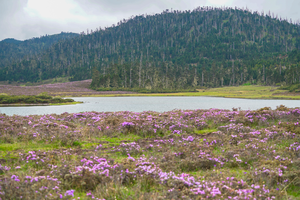当十月千湖山第一场雪降临的时候,杜鹃花已经开始悄悄地孕育来年的花蕾了。千湖山开始寂静下来,草原上和湖里慢慢地都积满了雪,一片银妆素裹的世界里,在老熊的鼾声中,深厚的积雪盖过了千湖山整个的冬天。