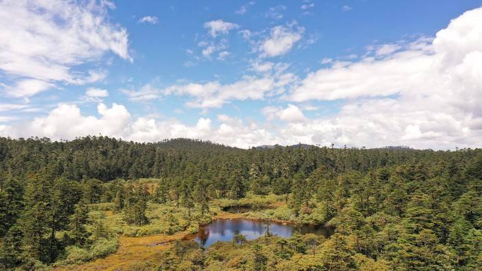 每年秋天,草原上的牛羊似乎更早地感到了秋的临近,从高山草原向山下逐步退移,牧民们也在为搬迁下山做准备,五角枫、大果红杉等植物却正忙着换上鲜艳的秋装,千湖山一片五彩斑斓。成群的黄鸭越过森林在湖间飞来飞去,老熊开始找树洞准备冬眠,各种植物的果实挂满枝头。