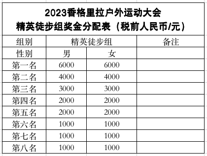 精英徒步组(23KM) 名次奖:根据比赛枪声成绩录取性别各前八名(税前人民币/单位:元)
