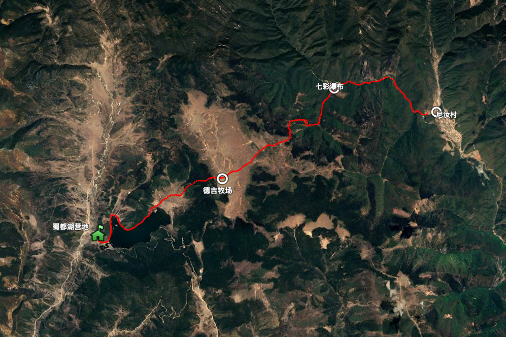 路线:蜀都湖营地乘车→码头停车场(开始徒步)→德吉牧场→七彩瀑布→尼汝村(徒步距离21公里)