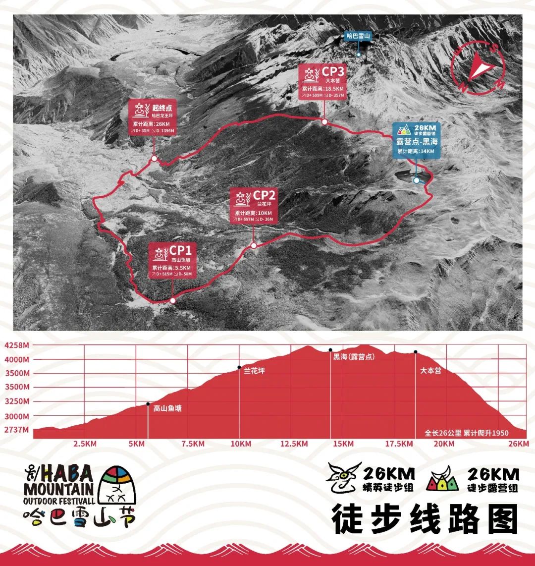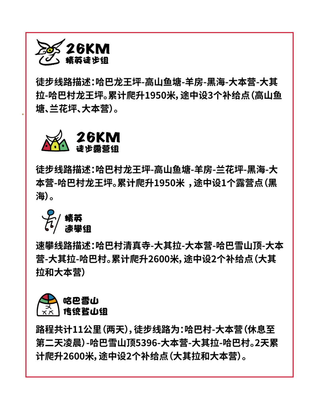 事项 | 26公里精英徒步组 | 26公里徒步露营组 | 速攀哈巴精英组 | 普通大众登山组 |