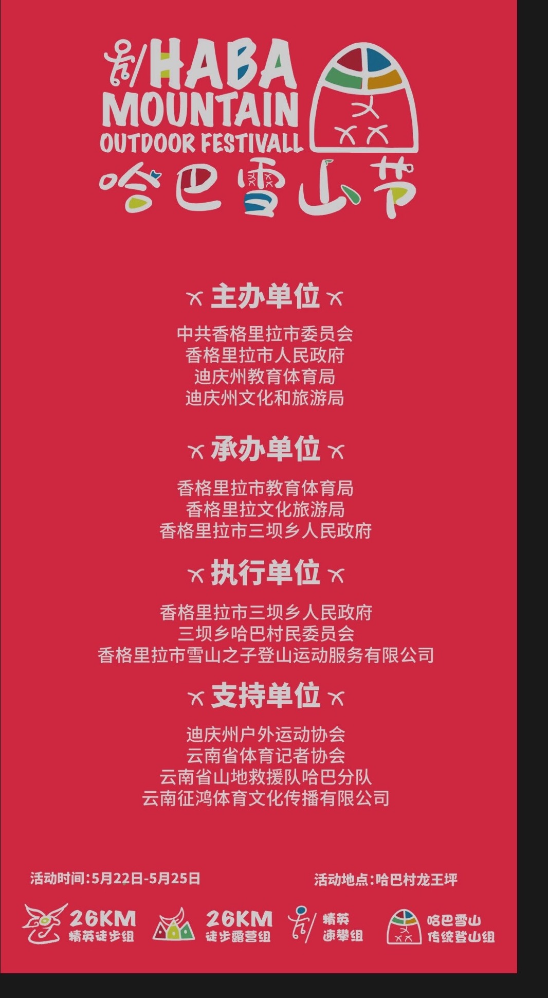 奖项 | 26K精英徒步组 | 26K徒步露营组 | 速攀哈巴精英组 | 普通大众登山组 |
